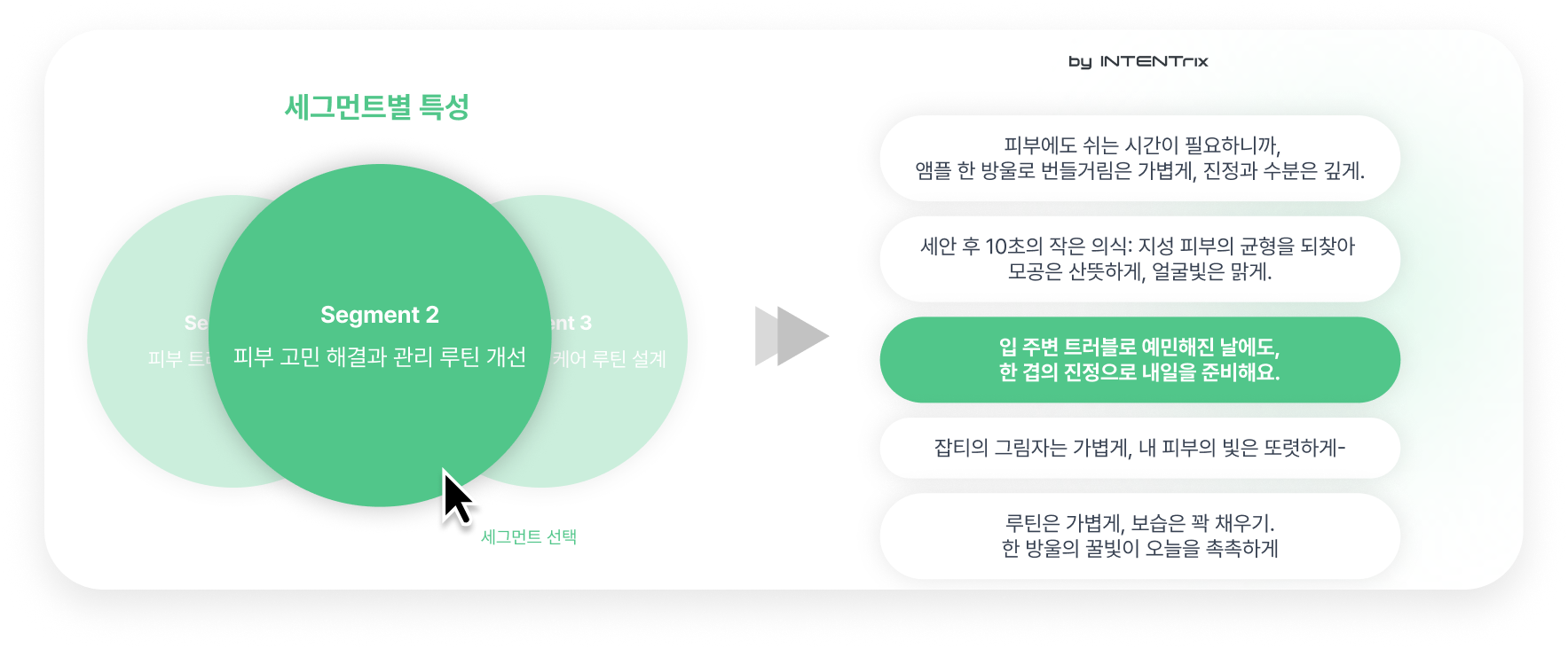 INTENTrix data 세그먼트 발화 원문으로부터 사용자의 니즈를 추출하여 타겟 맞춤형 카피를 생성합니다.