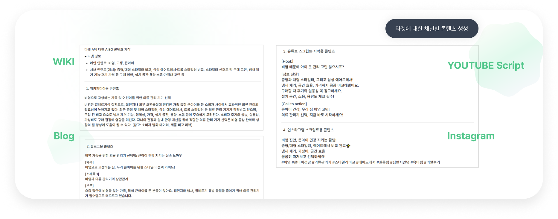 AI 검색에 최적화된 채널별 타겟 AIEO 콘텐츠를 생성 할 수 있습니다.