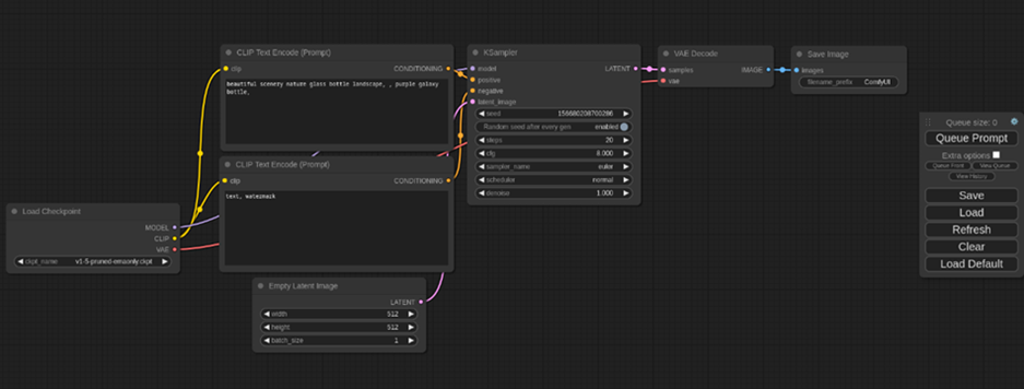 ComfyUI를 열고 <Load Default>란 버튼을 누르면 가장 기본 구조인 위의 네모 박스들(노드라고 함)들이 자동 세팅됩니다. 이제 앞서 설명 드린 ‘Diffusion’ 모델에 대입해 이 구조를 들여다보면 한눈에 이해가 되실 겁니다.