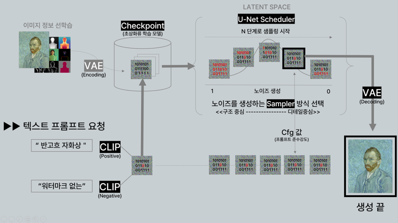 Diffusion 모델이 시중의 서비스화되기까지에는 이를 가능하게 하는 핵심 기술이론과 과정의 흐름이 존재하는데요 개요를 도식화하면 위와 같습니다. 먼저 생성하려고 하는 이미지들의 선(先) 학습모델 탱크인 ①Checkpoint 모델을 불러옵니다. 여기에는 이미지를 압축하여 정보로 치환하는 ②VAE(Variational Autoencoder)기술로 연산을 최소화하게끔 압축된 이미지 정보들이 들어있습니다. 제 뇌가 위의 픽셀 이미지 만으로도 고흐를 예측했듯, 수학적으로 이미지의 특징을 압축하는 모델이며, 압축을 해서 Encoding 한 방식을 역산으로 Decoding 하여, 정보를 이미지화 하는데 다시 쓰입니다.