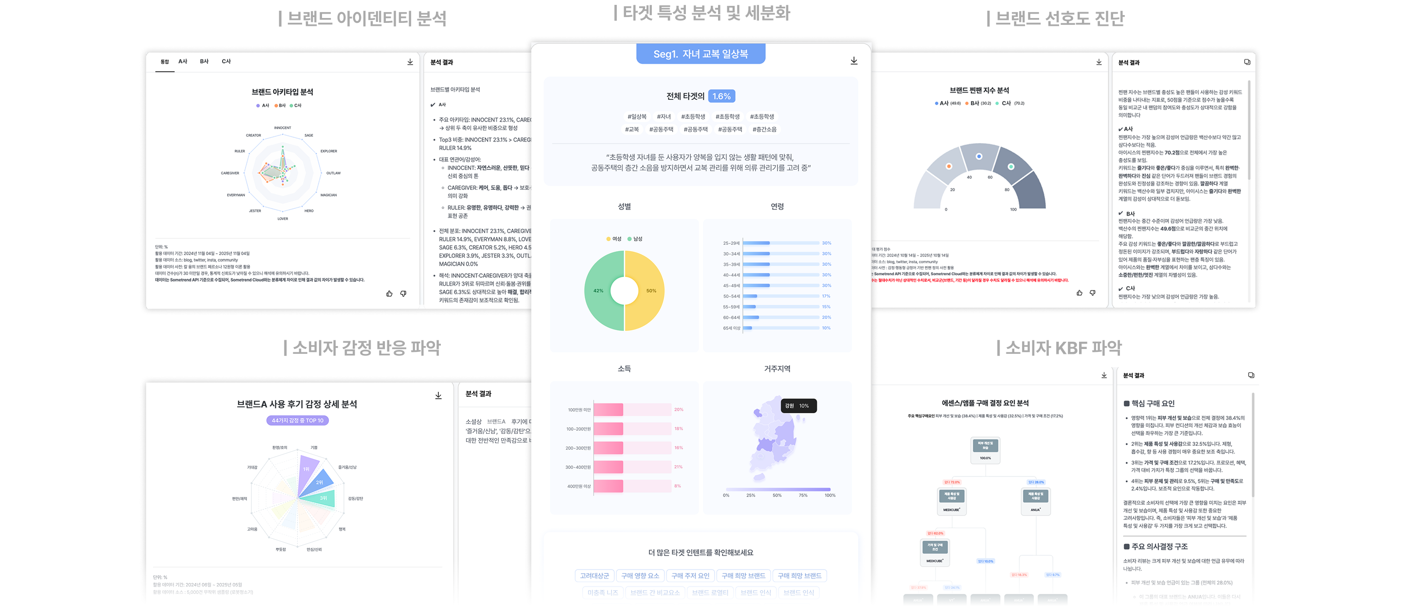 브랜드아키타입분석브랜드이모셔널본딩맵브랜드찐팬지수KBF 스코어링 분석광고모델 호감도 추이분석인텐트 기반 콘텐츠 효과성 진단채널별 콘텐츠비중 추이 분석키워드 언급 비중 분석