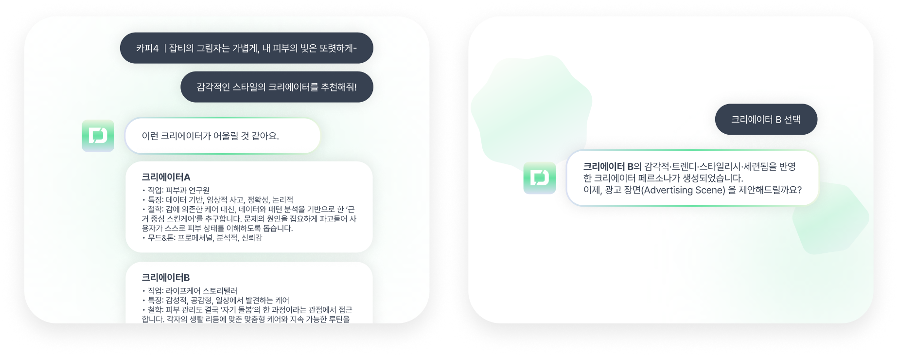 선택한 카피 및 톤앤무드를 바탕으로 크리에이터를 추천하고,
