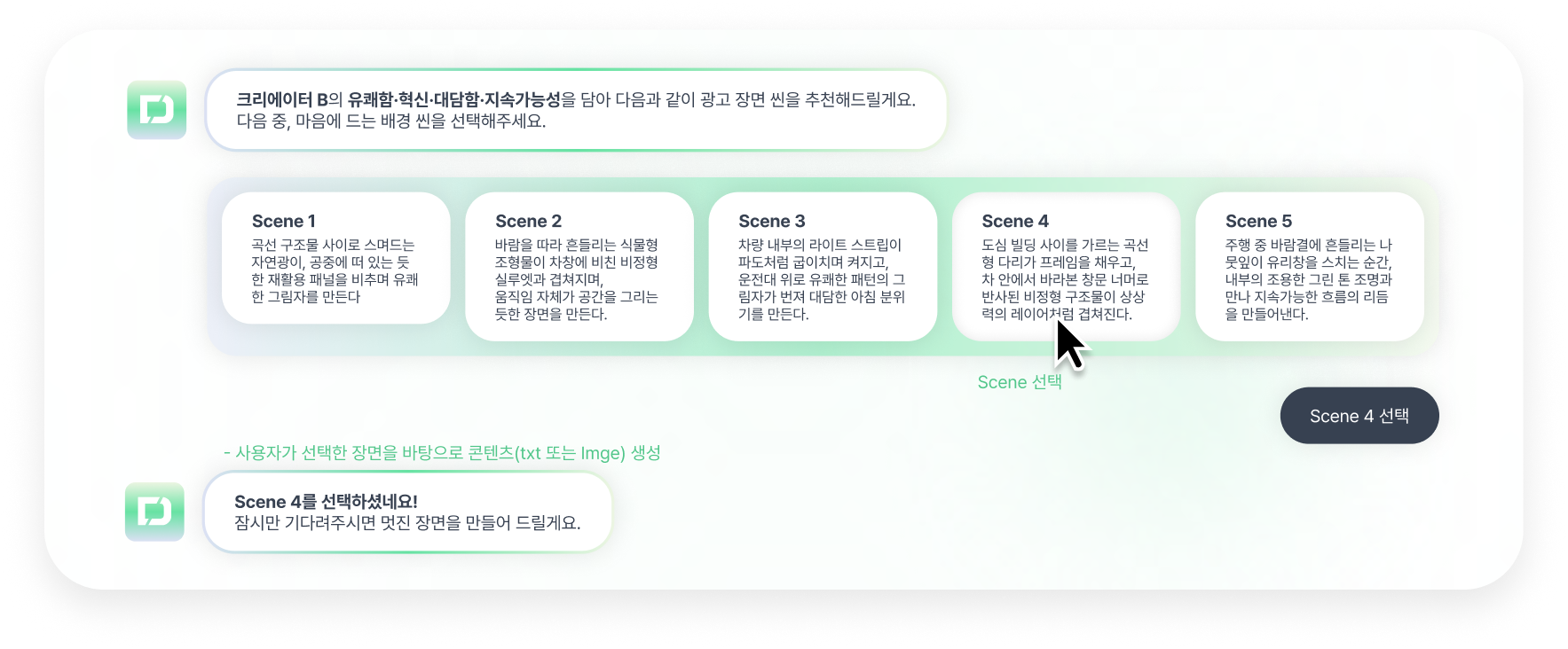 사용자가 선택한 장면을 바탕으로 생성된 콘텐츠를 AI 친화 콘텐츠로 활용 할 수 있습니다.