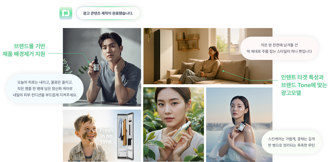 브랜드별 톤앤매너와 매체 특성에 맞는 AI 생성 콘텐츠를 제작합니다.