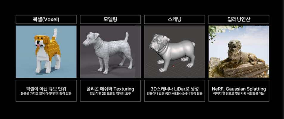 3D는 한마디로 입체, 쉽게는 빛반사와 색 밀도로 구성된 비주얼입니다. 컴퓨터 그래픽스(CG)에서 이 3D를 생성하기 위해서는 크게 아래의 4가지 방식으로 접근이 가능해졌는데요.